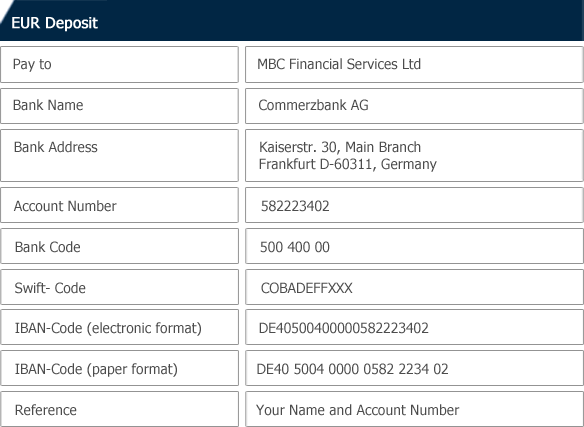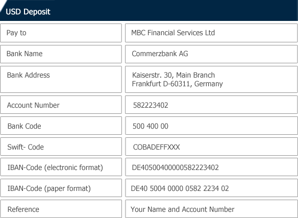 Important: When making a bank transfer to Commerzbank AG please include your name and your MBCFX Account number as part of the reference